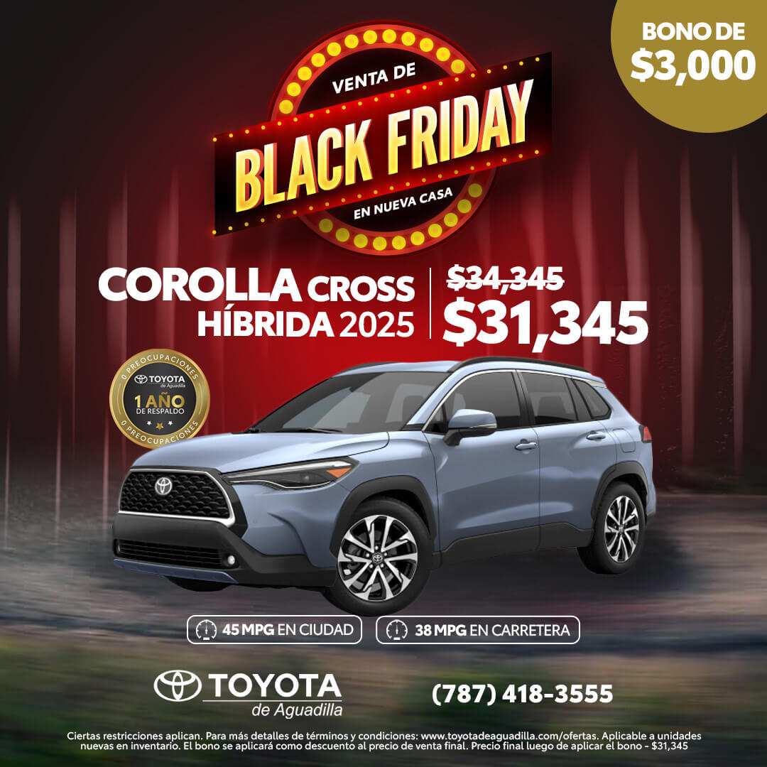 Toyota Corolla Cross Híbrida (código 6390) - Precio final: $34,345 / $3,000 de bono. MPG estimado: 45 ciudad / 38 carretera; 42 combinado. Aplicable a unidades nuevas en inventario. El bono se aplicará como descuento al precio de venta final. Precio final luego de aplicar el bono - $31,345