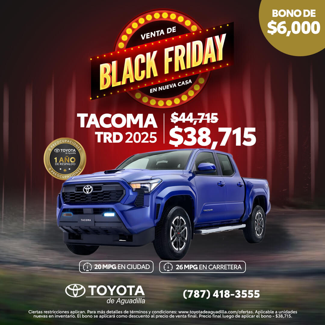 Toyota Tacoma (código 7304) - Precio final: $44,715 / $6,000 de bono. MPG estimado: 20 ciudad / 26 carretera (para trim base). Aplicable a unidades nuevas en inventario. El bono se aplicará como descuento al precio de venta final. Precio final luego de aplicar el bono - $38,715