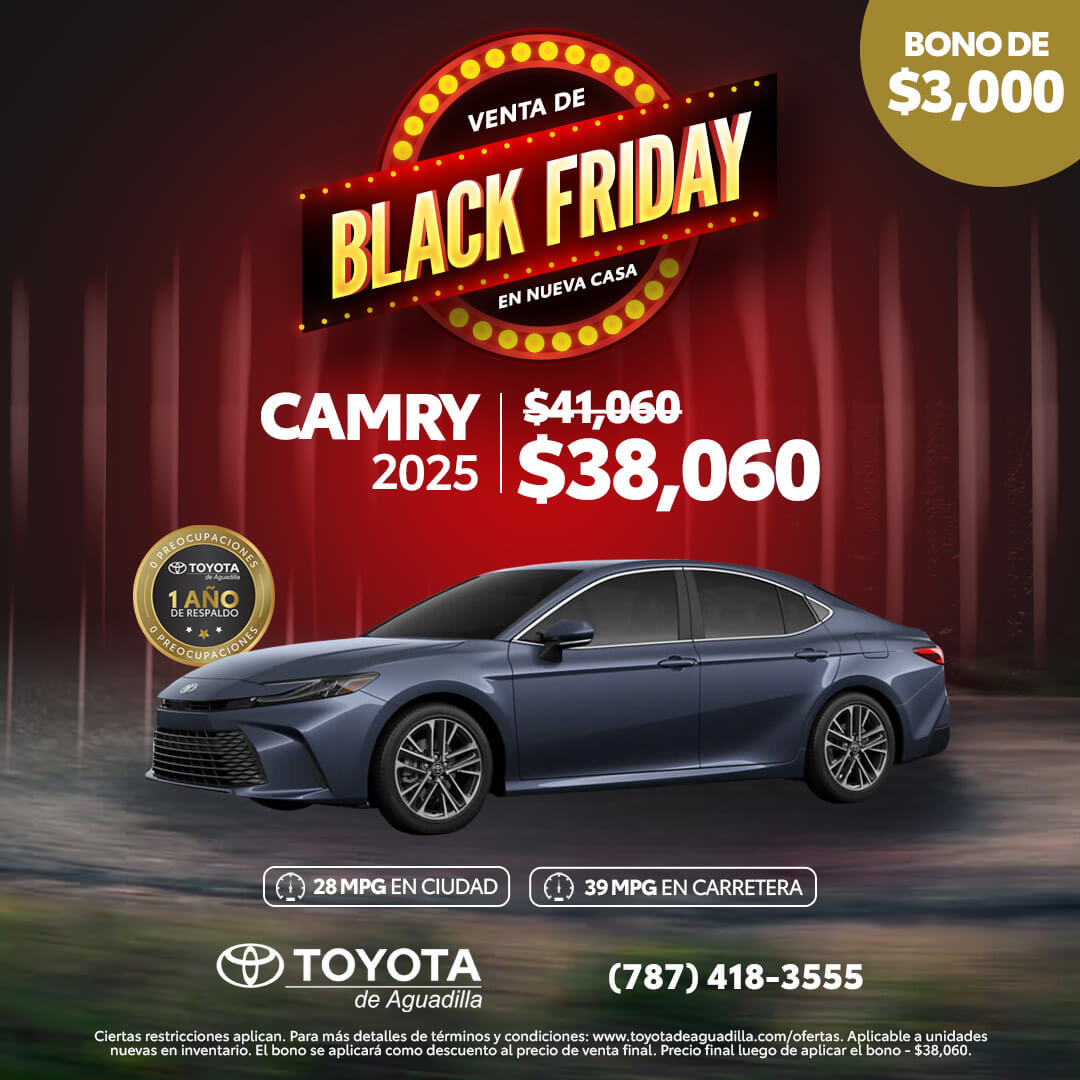 Toyota Camry (código 2612) - Precio final: $41,060 / $3,000 de bono. MPG estimado (gasolina): 28 ciudad / 39 carretera / 32 combinado . Aplicable a unidades nuevas en inventario. El bono se aplicará como descuento al precio de venta final. Precio final luego de aplicar el bono - $38,060