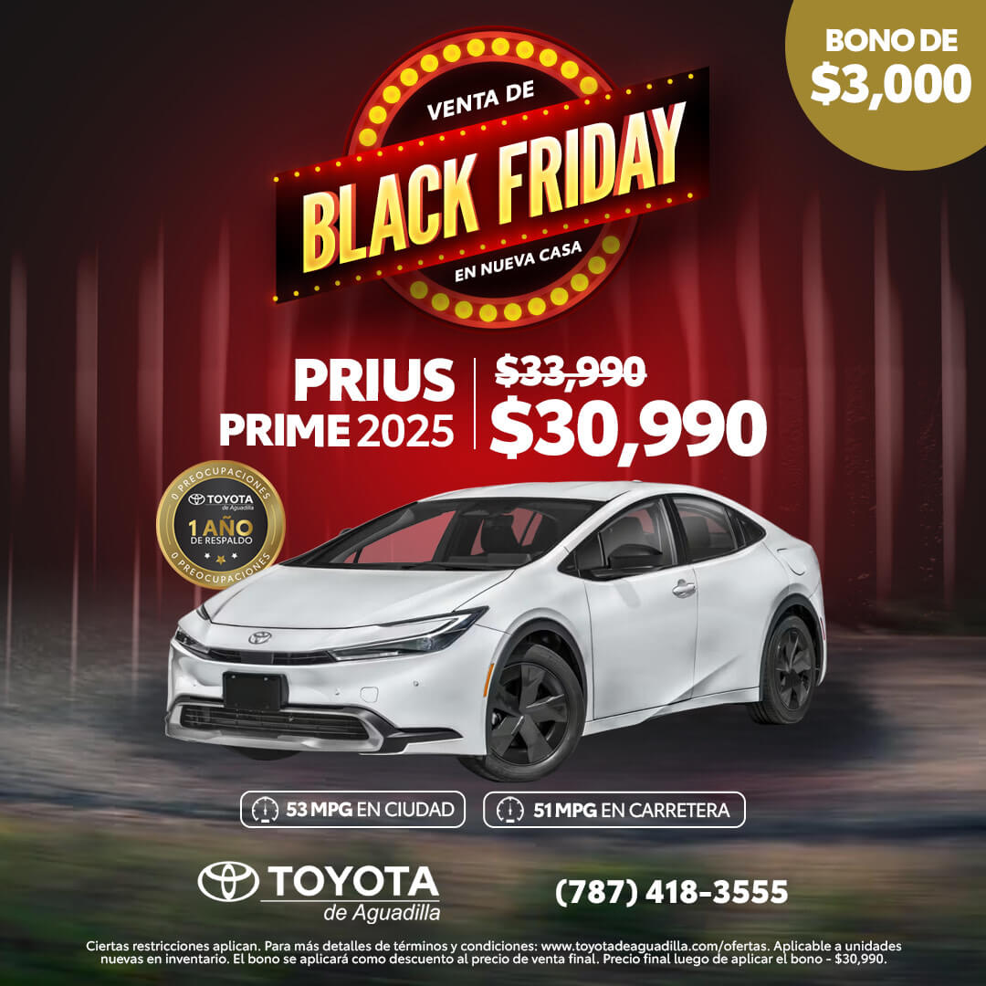 Toyota Prius Prime (código 1170) - Precio final: $33,990 / $3,000 de bono. MPG estimado: 53 ciudad / 51 carretera / 52 combinado. Aplicable a unidades nuevas en inventario. El bono se aplicará como descuento al precio de venta final. Precio final luego de aplicar el bono - $30,990